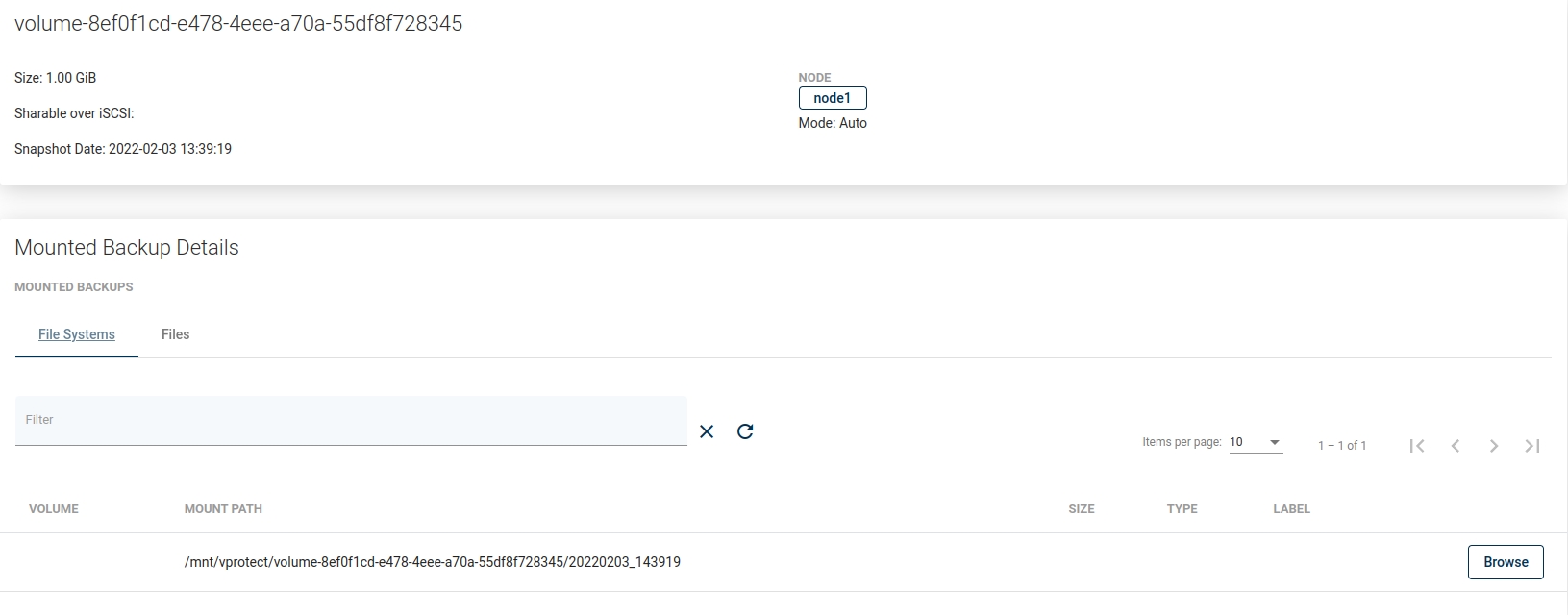 Storage- mounted instance nameMODE- Auto - DPX vPlus auto-detects filesystems and mounts them on the path "/mnt/vprotect/". In Manual mode, the user chooses the mount point for selected filesystems.NODE- the DPX vPlus node is responsible for the mounting job.SNAPSHOT DATE- the date when the backup was created.FILE SYSTEMS- the number of mounted filesystems.FILES- the number of mounted virtual disk images.