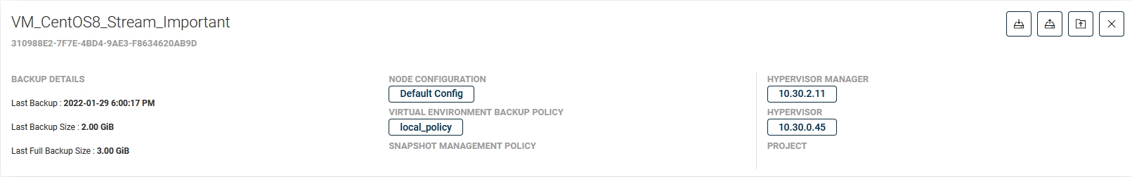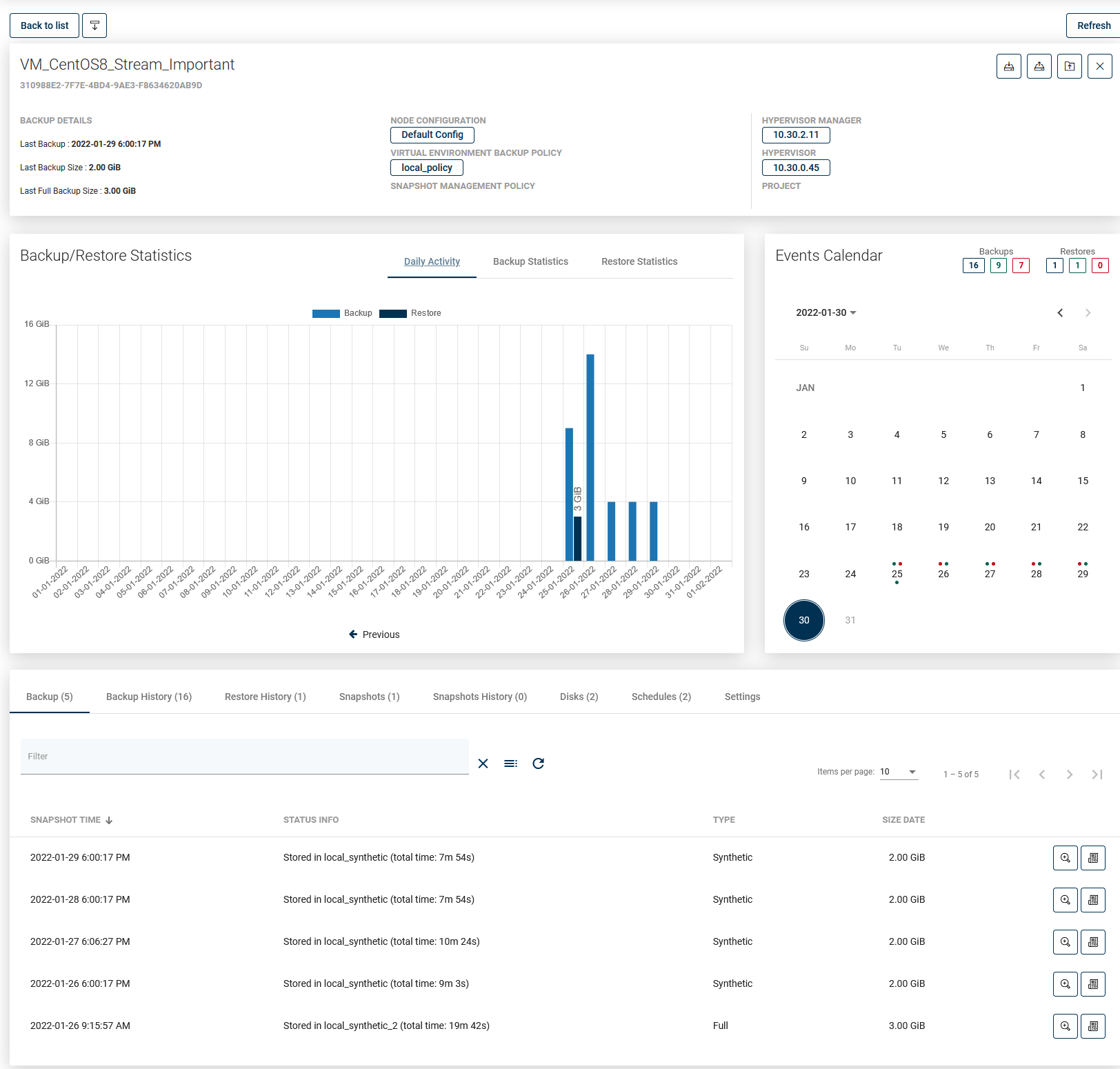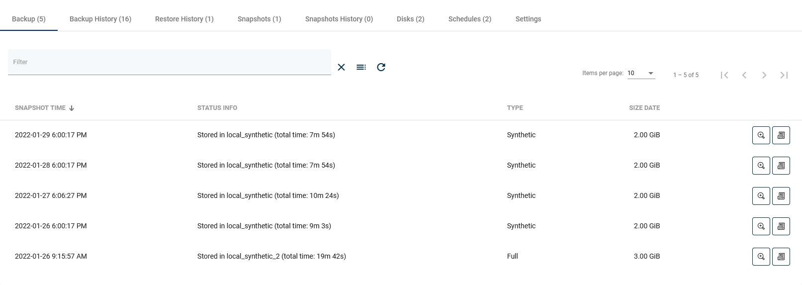 A list of currently known virtual machines and access to the details page of each object. From this place, you can also perform on-demand actions such as backup, restore, and file-level restore.