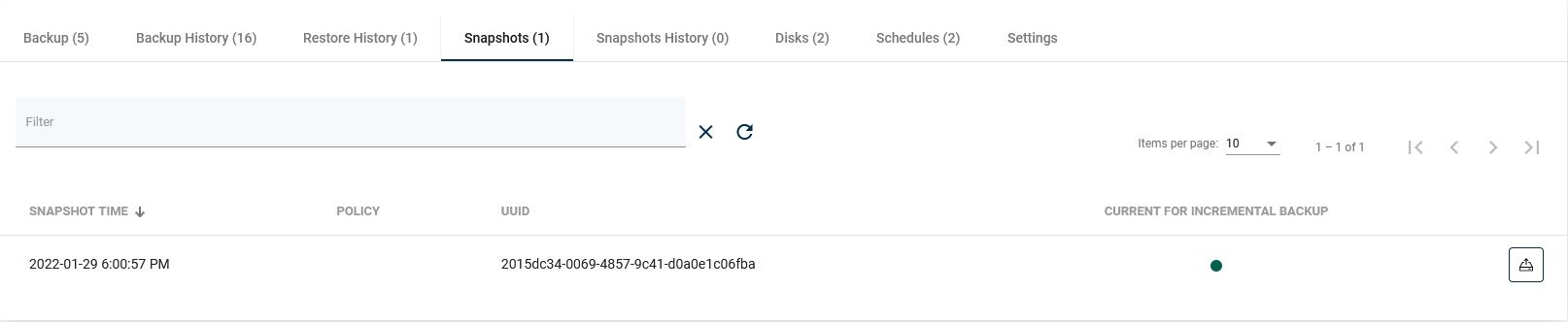 1. As you can see in the list above, there is a green dot next to the snapshot. This means that this snapshot is created for incremental backup purposes. This is an automatic operation and we only keep the last snapshot.