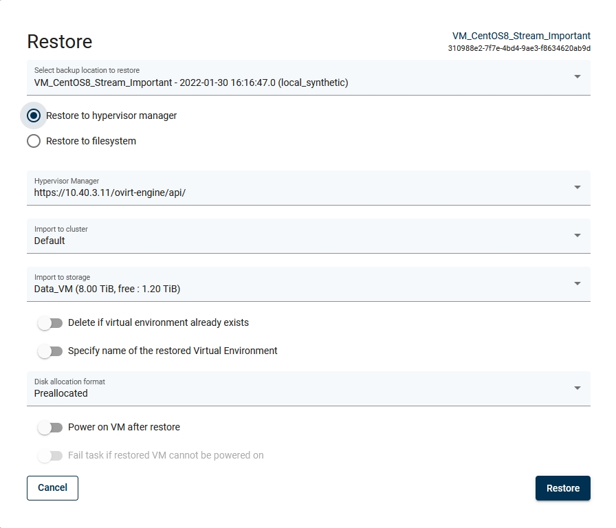 Restoring to a hypervisor or hypervisor manager is allowed for several providers, but not for all (for detailed info go to DPX vPlus Support Matrix).