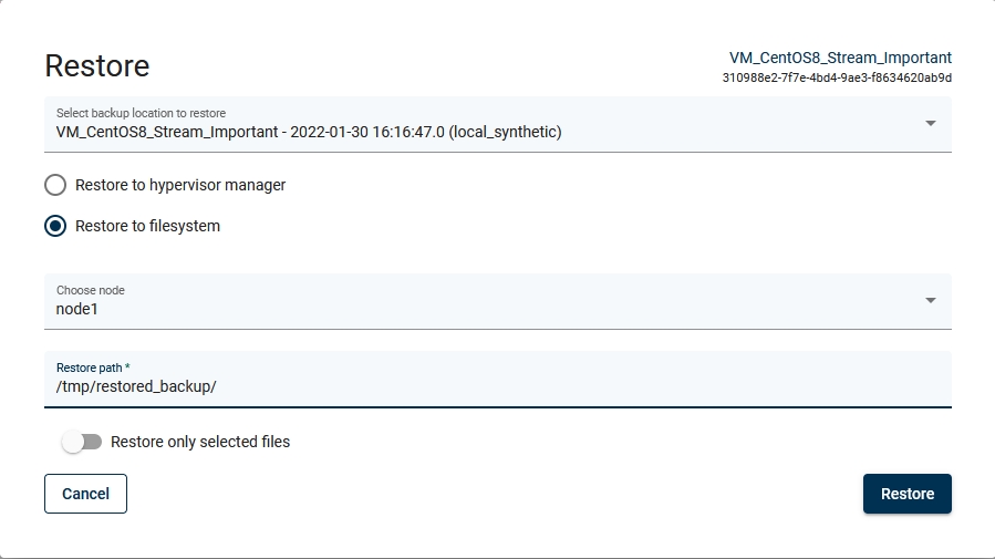 Restoring to the filesystem is an option to restore VMs directly to the DPX vPlus node storage. (Remember, the DPX vPlus user must have the appropriate write permissions to the given path.)