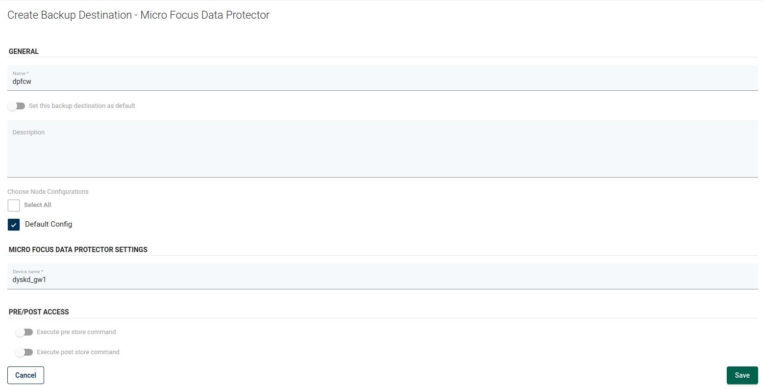 =======================================================================================================================================================================Next, go to DPX vPlus and go to Backup Destinations -> Enterprise. Clik Create Backup destination and choose Micro Focus Data Protector. Type the name for new backup destination and provide Device name which you get from first step.