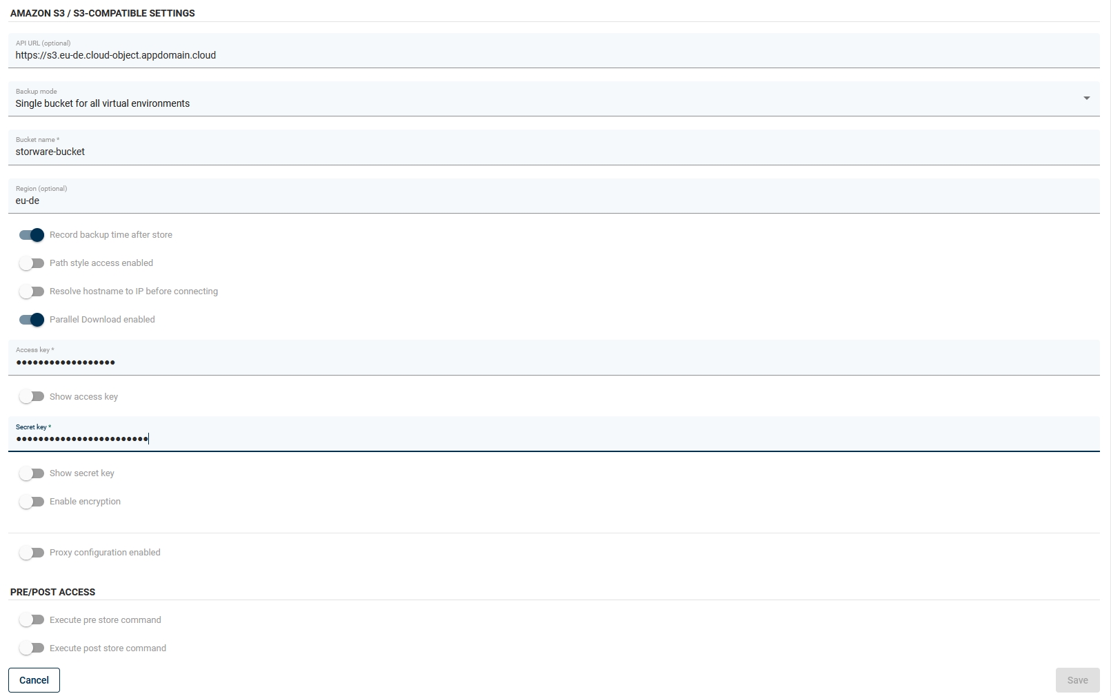 As IBM cloud storage is compatible with Amazon-S3, many settings will be very similar. However, remember to enter the API URL (remember about "https://" at the beginning), select the "Record backup time after store" option, and enter the region.