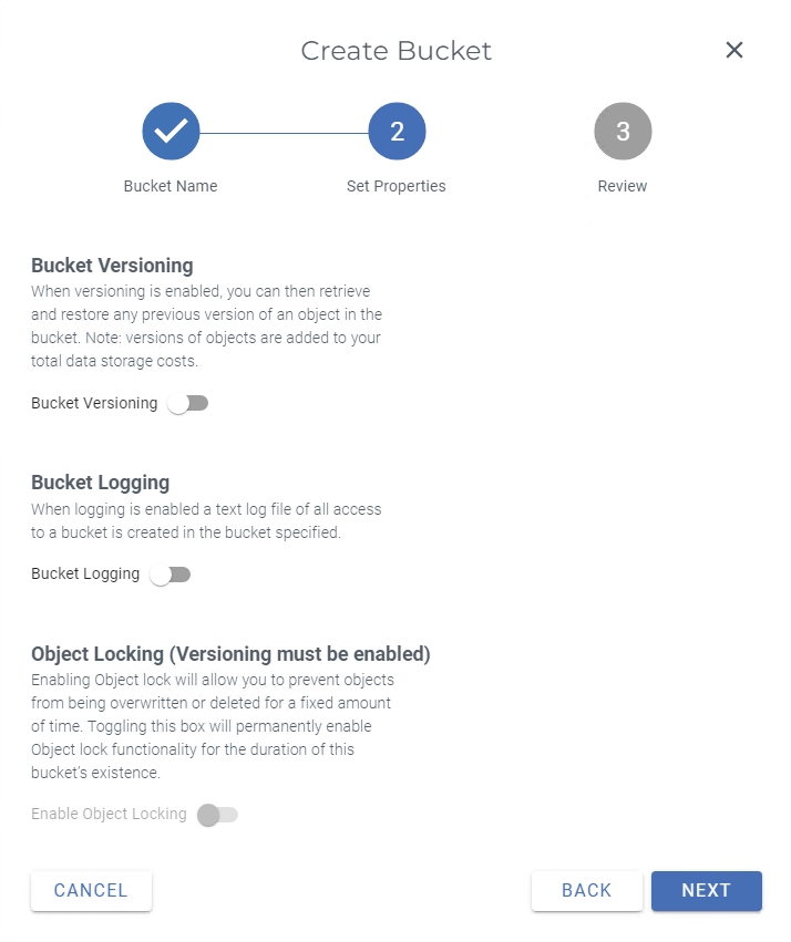 On the second tab, you can choose versioning within the bucket, login, and protect your bucket with object locking (a function used to protect against ransom attacks)