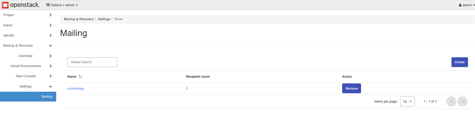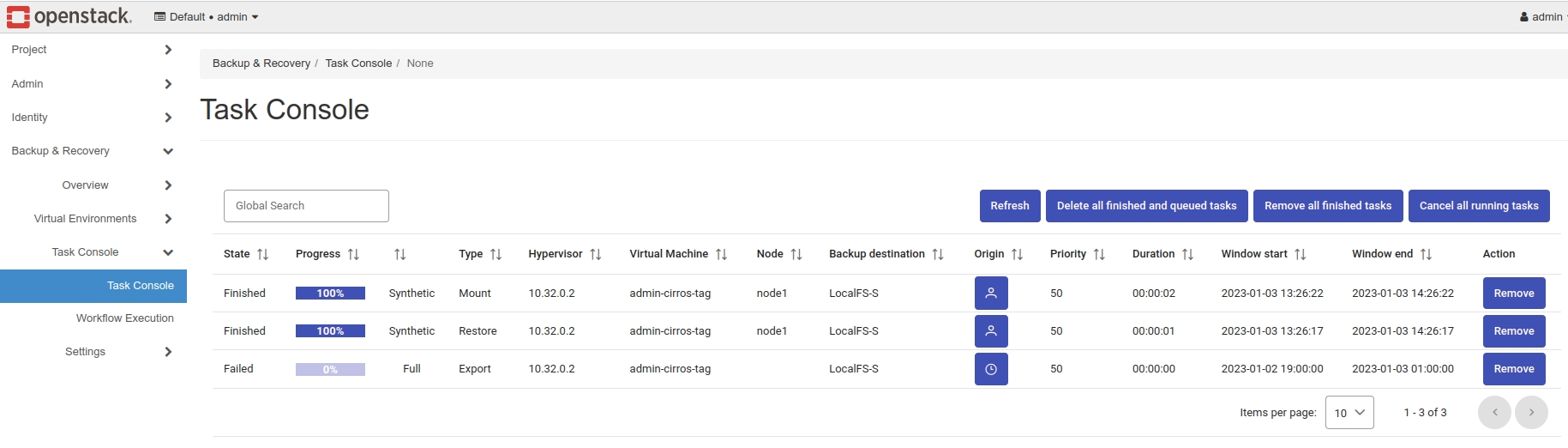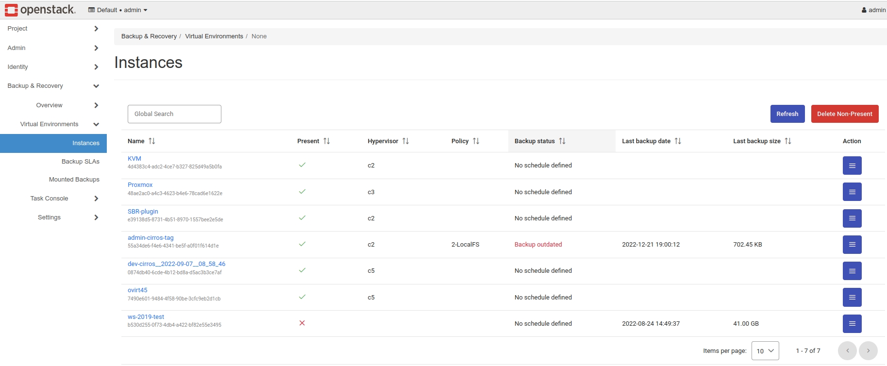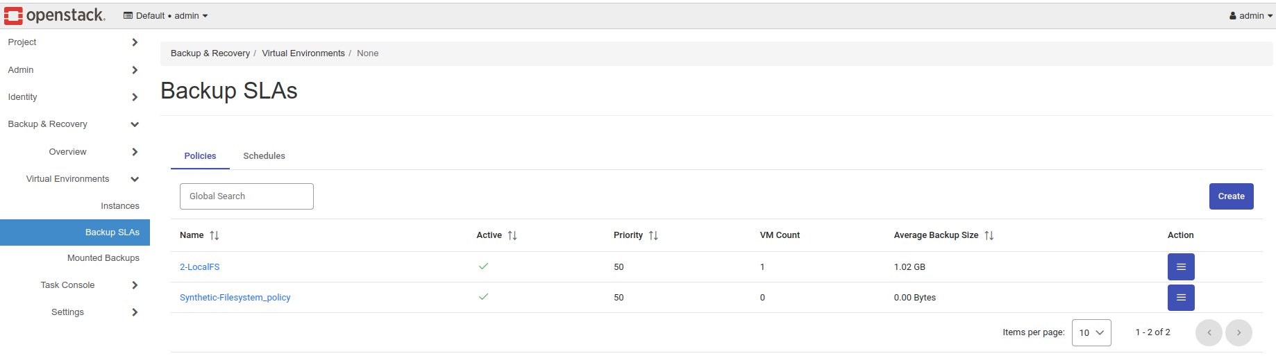 After installation (which is described at the end of this article) you will see a new tab "Backup & Recovery" in the OpenStack menu. This consists of several sub-tabs that allow you to perform basic actions such as backup, restore or create a new schedule.