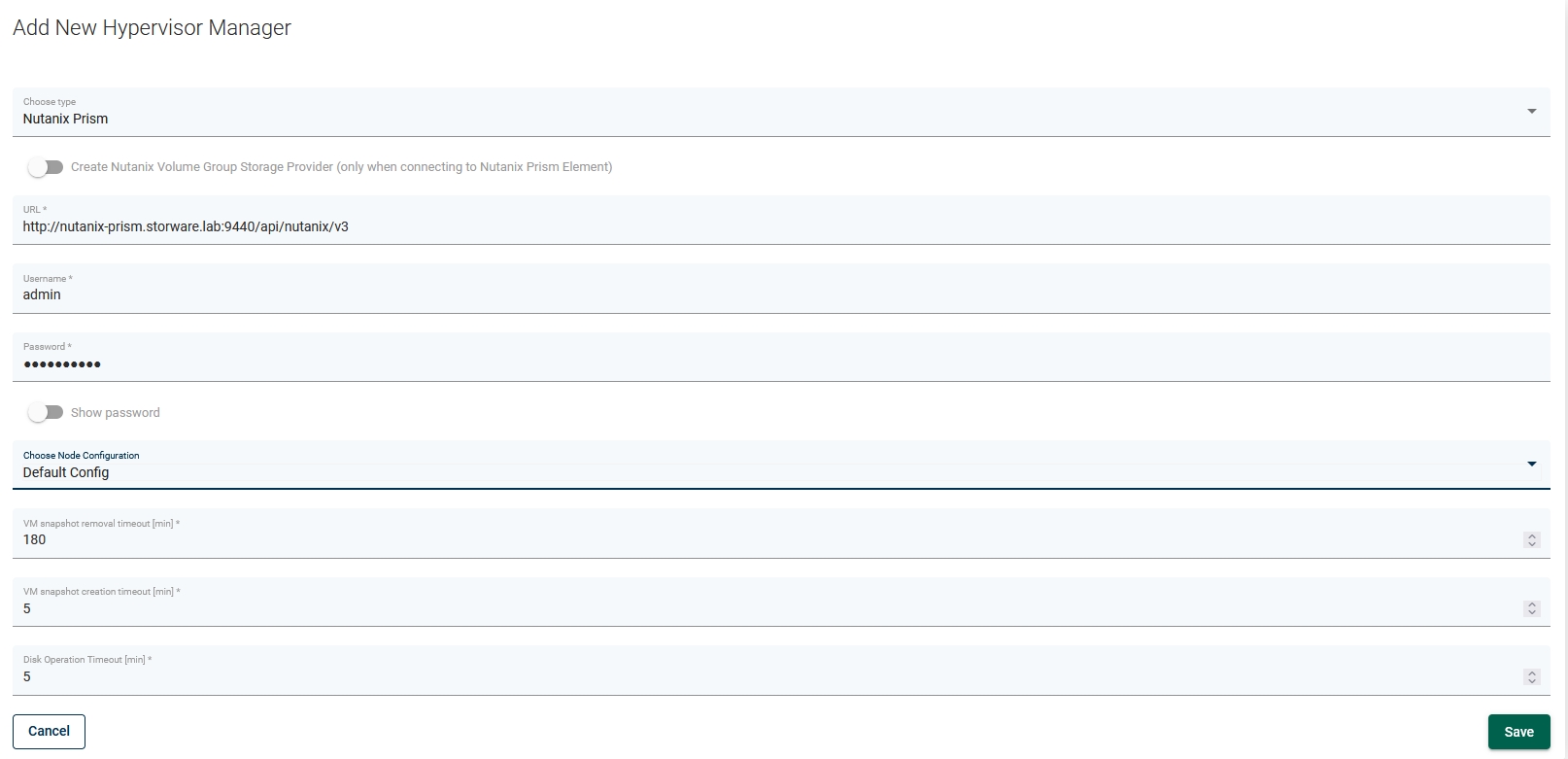 You can specify either a Prism Element or a Prism Central as hypervisor manager. If Prism Central is specified credentials for Prism Central and each Prism Element must be the same.