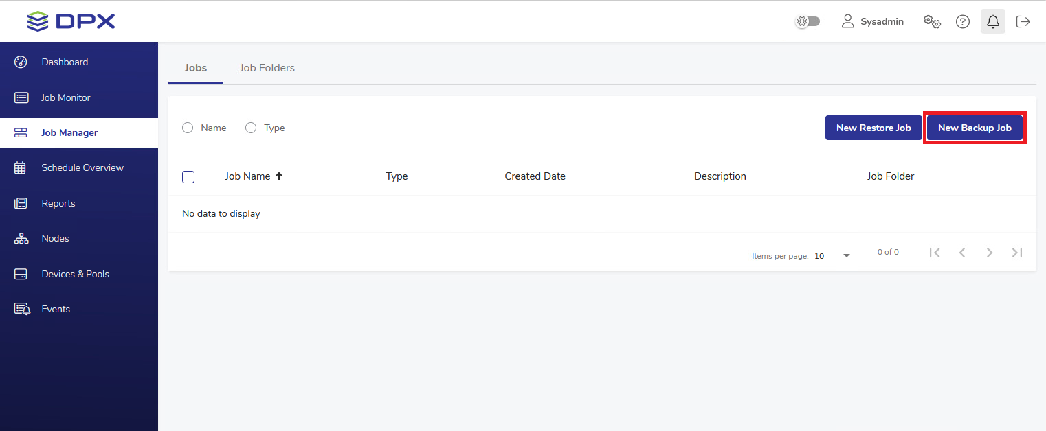 - In the main web interface view, go to Job Manager in the sidebar. Then select the New Backup Job button in the upper right corner.