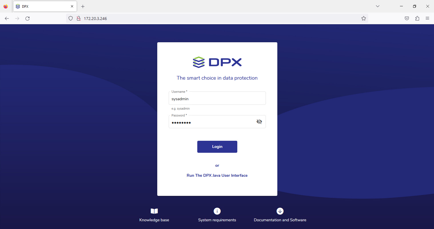 - In the login screen, enter the username and password for the Catalogic DPX Master Server.