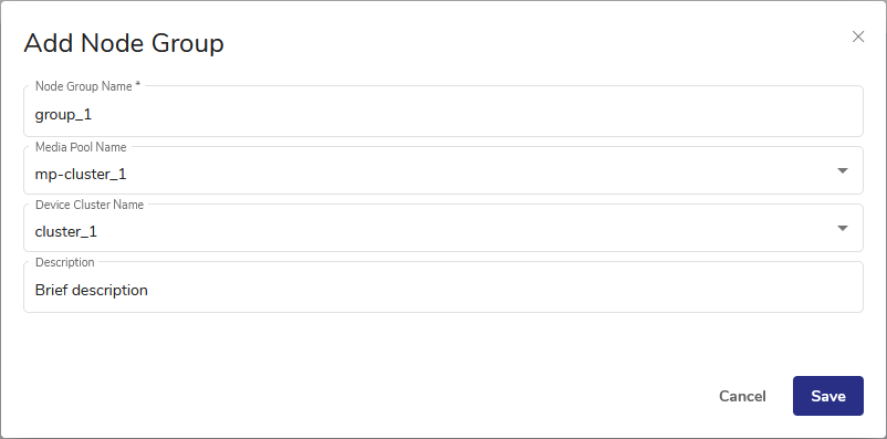- A device cluster is a set of storage devices, such as tape drives. If there are no device clusters or tape libraries in the pull-down menu, you can edit the node group later to add one.