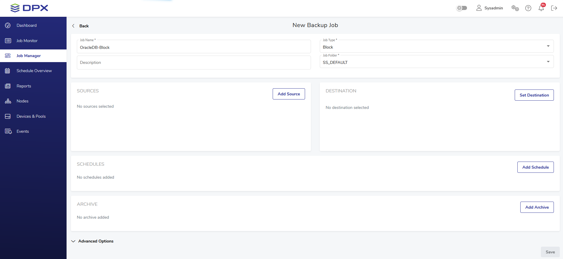 - Select Job Type – Block and the Job Folder to store the job in. By default, all jobs are stored in the SS_DEFAULT folder.