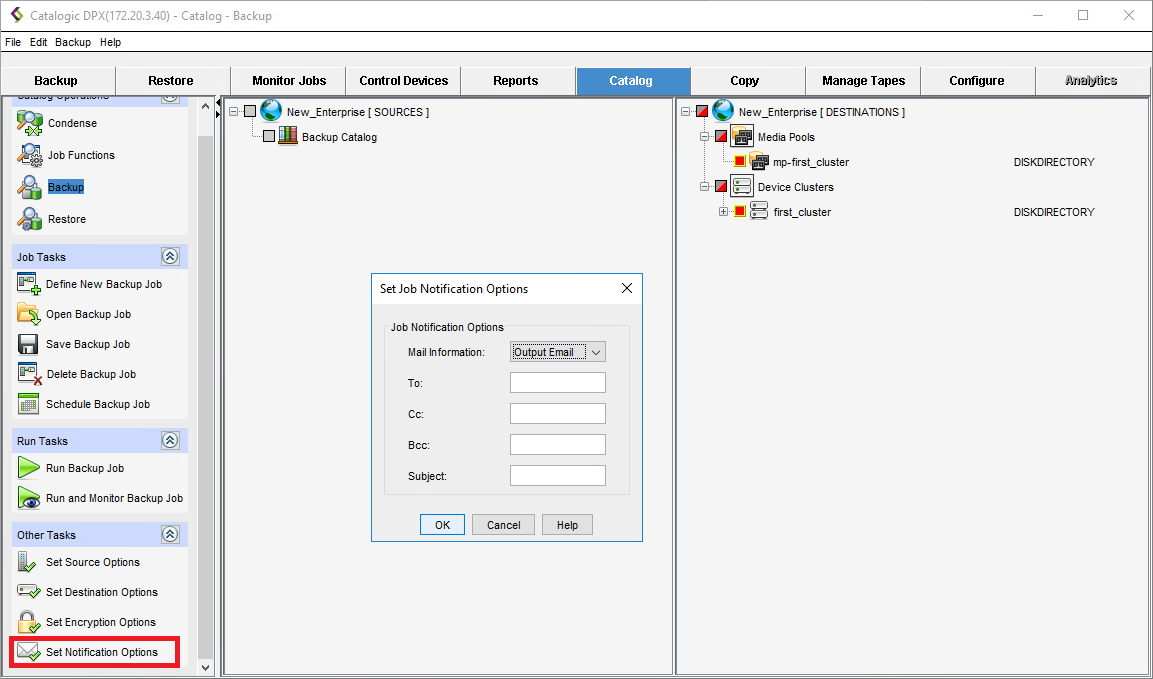 Catalog DPX offers several job options for Catalog backup. All of them are available from both interfaces but the access thereto may differ. See details for each interface below.