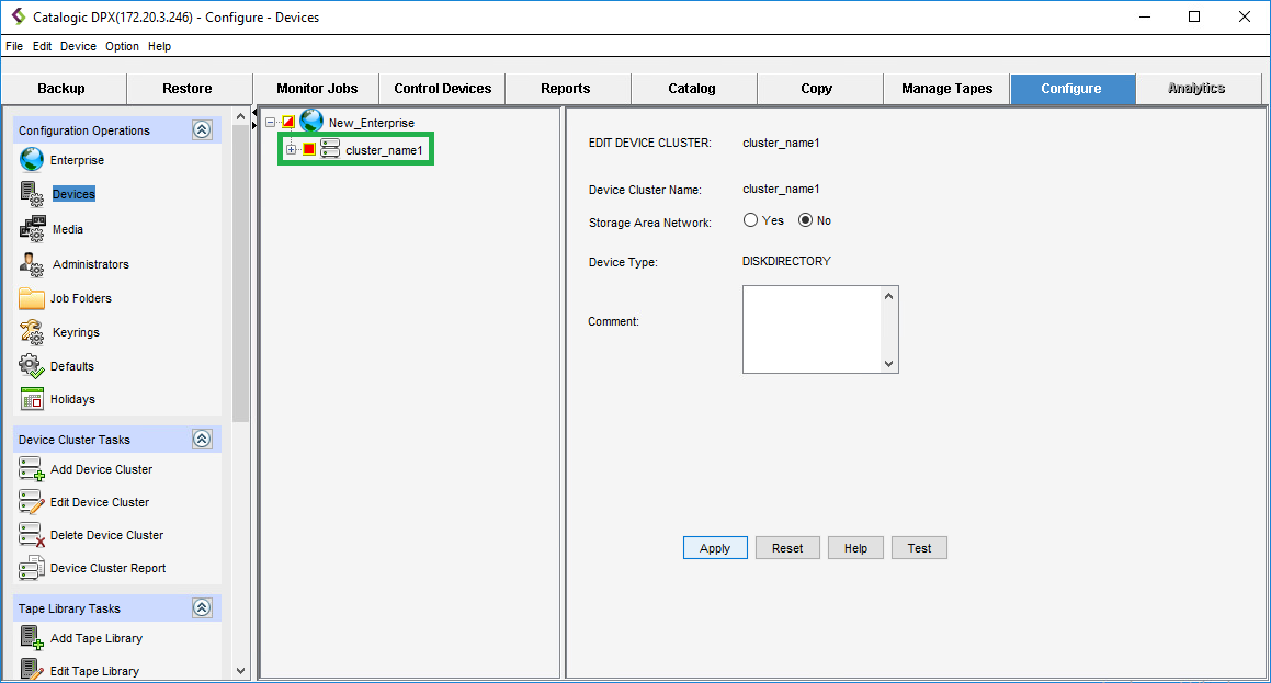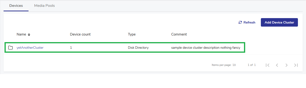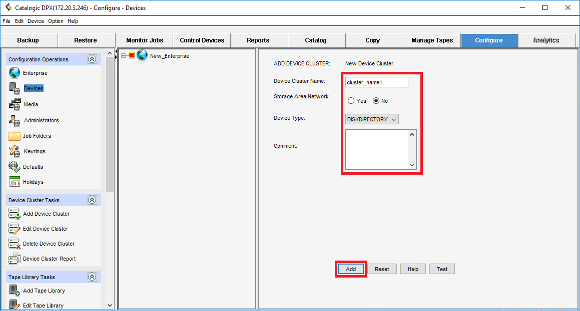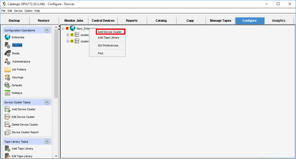 A device cluster is a logical grouping of non-tape library (standalone) backup devices. For information about adding a tape library, see Adding a Tape Library.