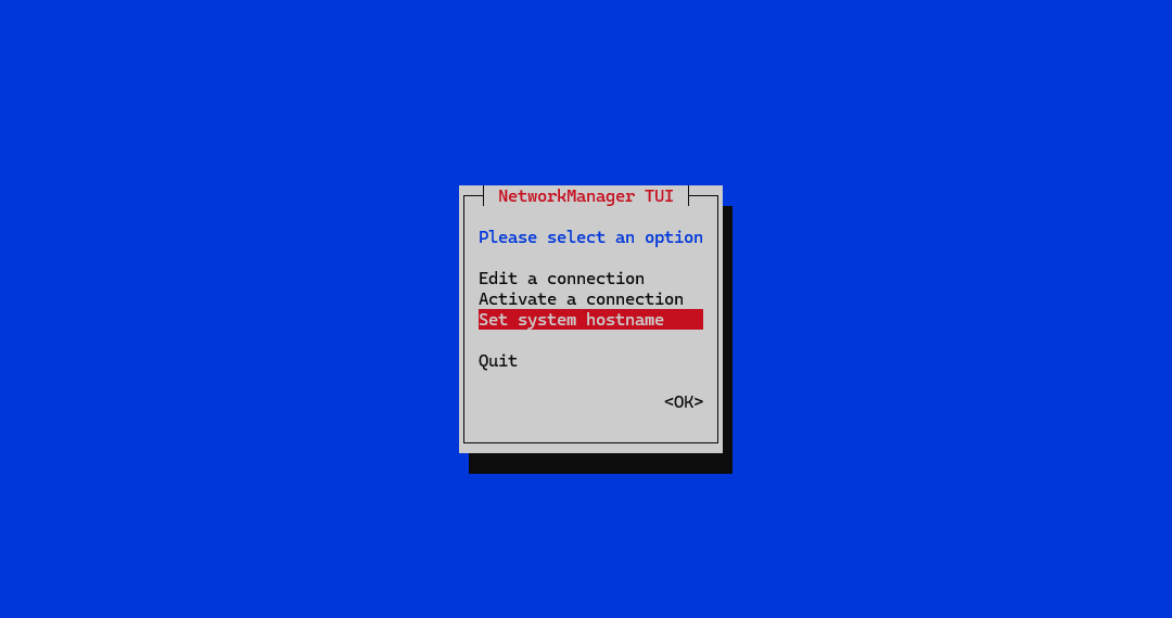 nmtuicommand to open the NetworkManager Text User Interface to modify the DPX Master Server appliance’s hostname or IP address to match what was previously set in the DNS.\