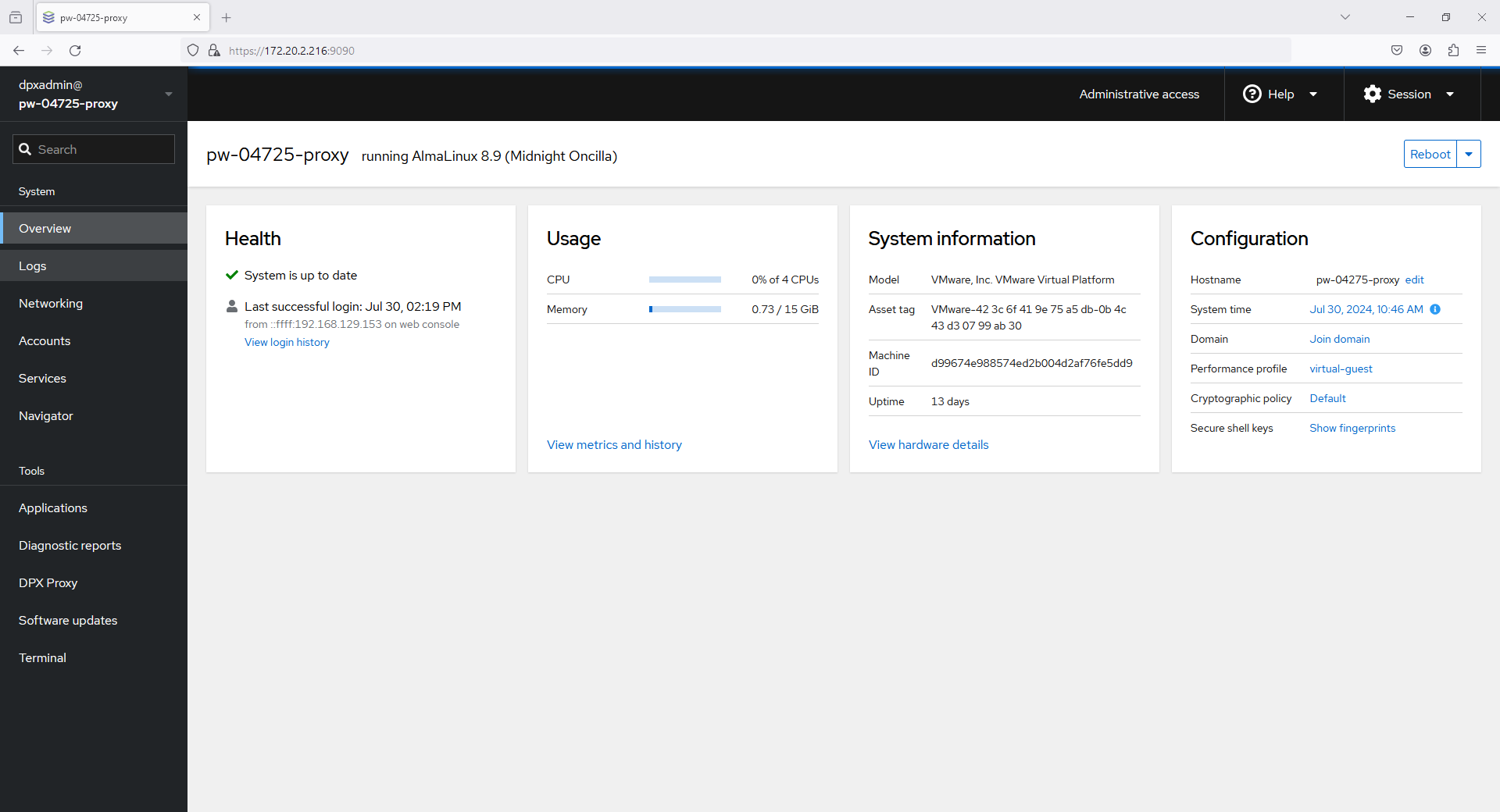 The Catalogic DPX Proxy Server virtual appliance includes the web (HTML5-based) interface. It allows the user to operate and monitor the proxy server from the web browser. The user can also access the Linux shell in the web browser window instead of using an SSH client.