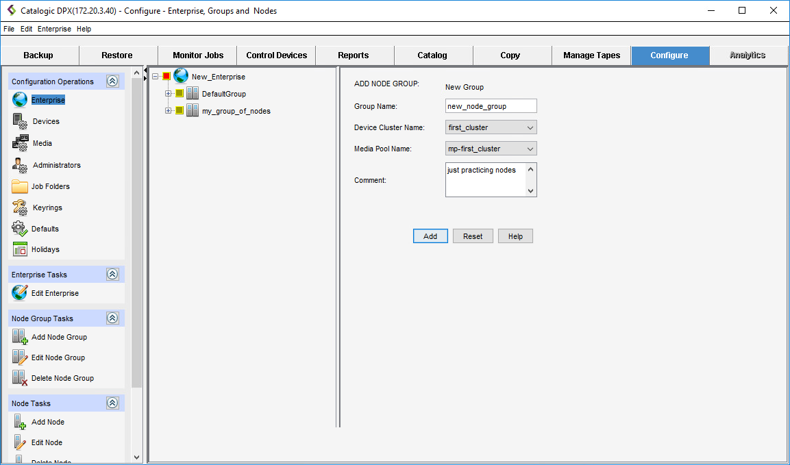 • A device cluster is a set of storage devices, such as tape drives. If there are no device clusters or tape libraries in the pull-down menu, you can edit the node group later to add one.