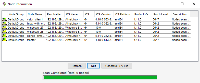 Run a Nodes Info scan to display the status of the nodes in the Enterprise. The display lists all nodes in the Enterprise, identified by node group, node name, and resolvable name. The operating system name, architecture, platform, and description are also displayed for each node. Importantly, the display indicates the product version and patch level running on the node. The node icon on the left is filled with green if the node is at the current release and patch level. The node icon is filled with red if the node is not at the current level or if information could not be obtained.