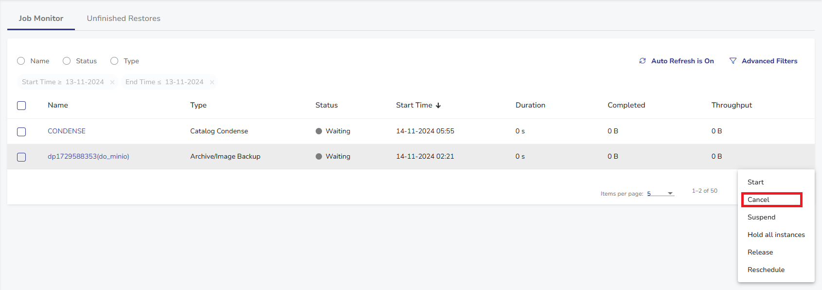 - Hover your mouse over the scheduled job you want to hold, then select Actions > Cancel.