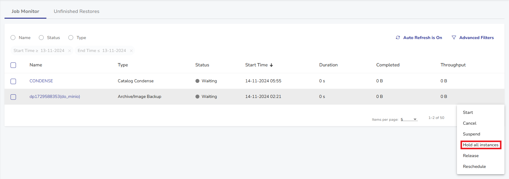 - Hover your mouse over the scheduled job you want to hold, then select Actions > Hold all instances.