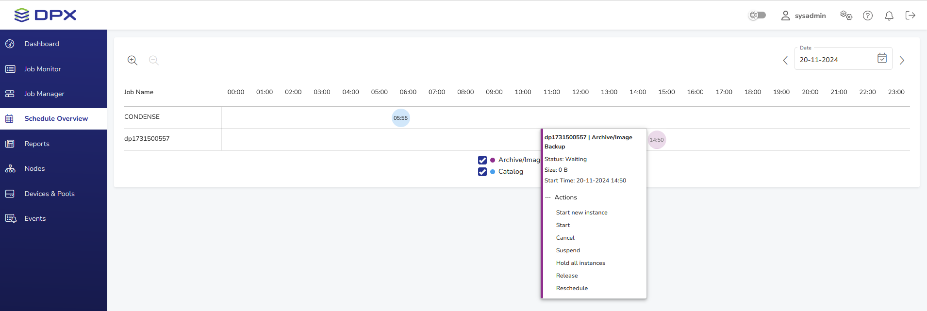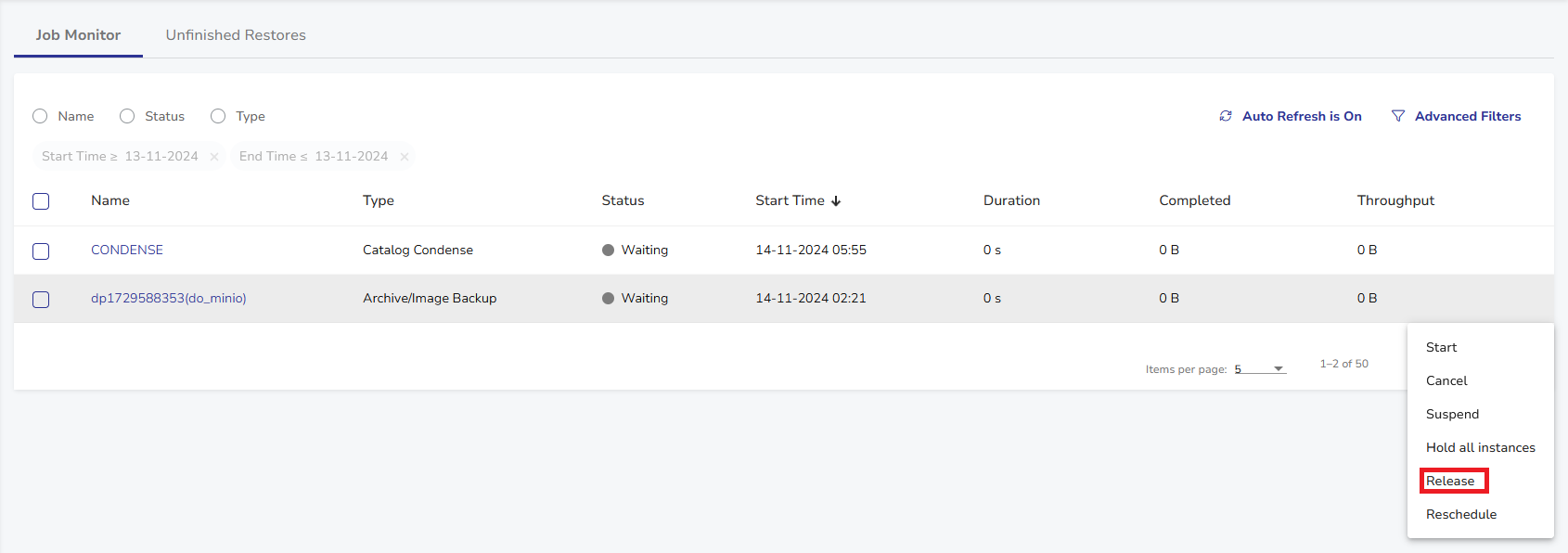 - Hover your mouse over the scheduled job you want to hold, then select Actions > Release.