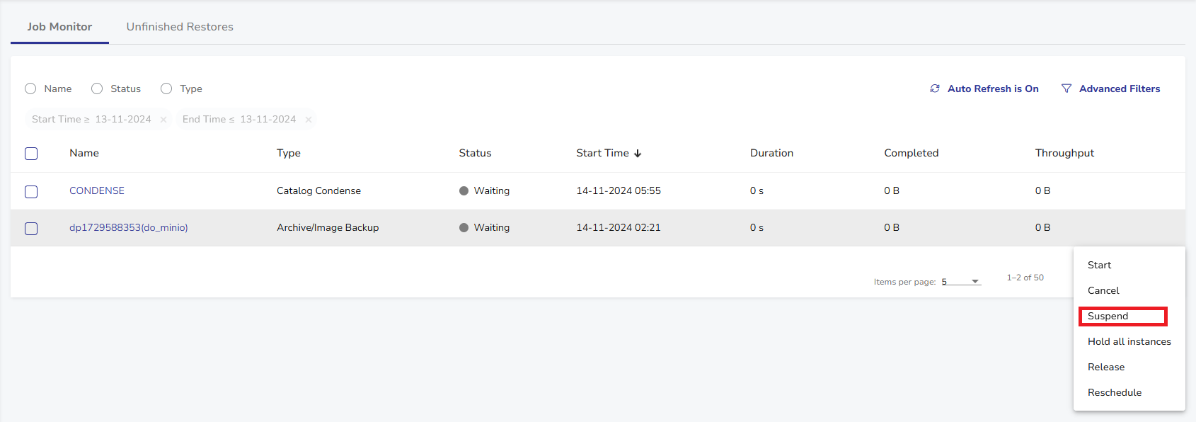 - Hover your mouse over the scheduled job you want to hold, then select Actions > Suspend.