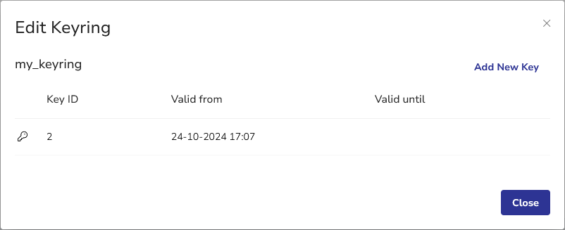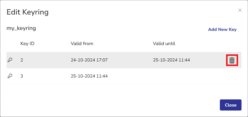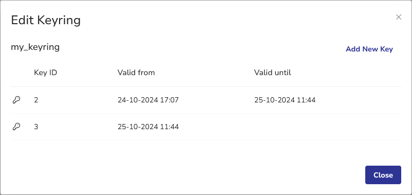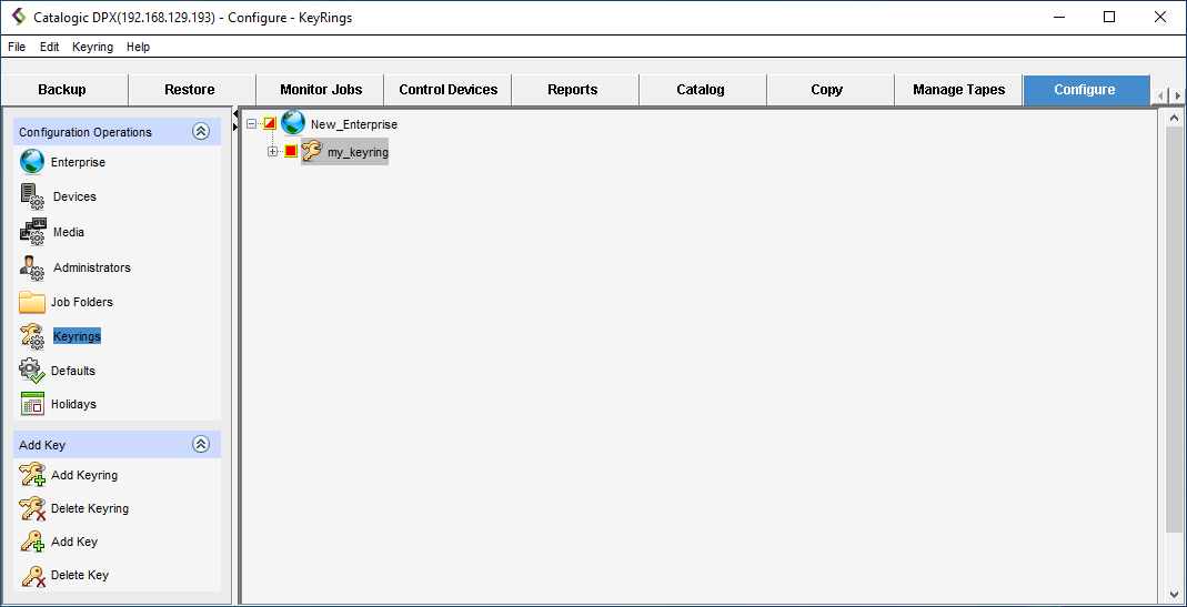 Each key in a keyring is assigned to a period when it is applicable for backup and migrate jobs. At any time, only one key in a keyring is applicable. The other keys in a keyring, although retired, may still be needed for restore and migrate jobs.