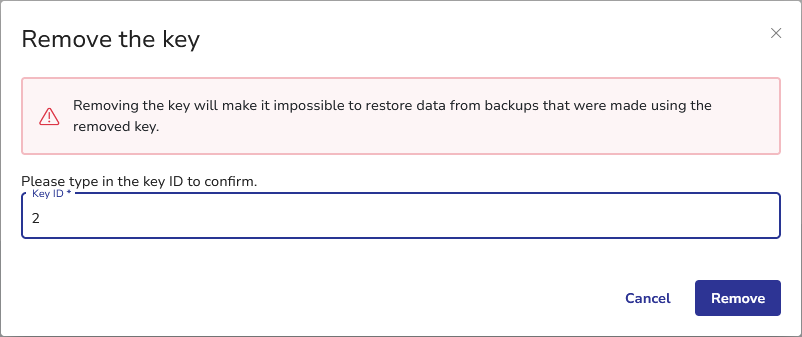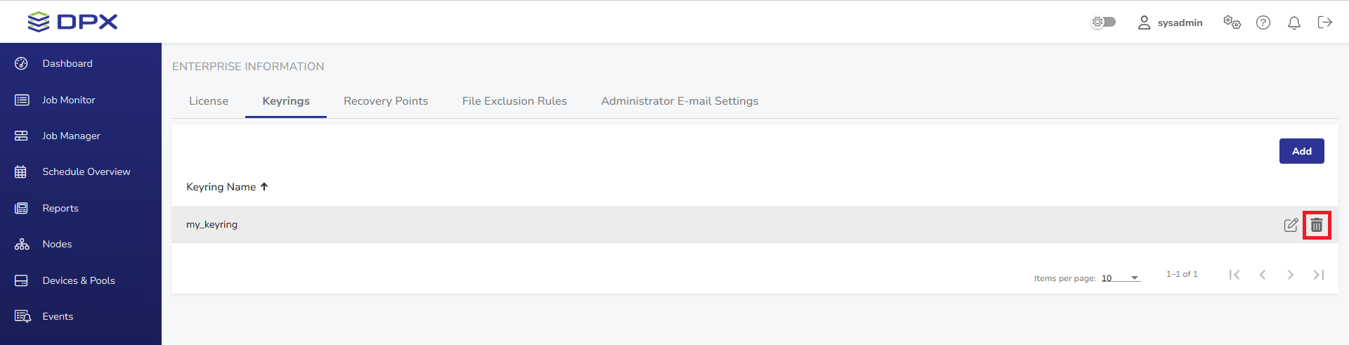 Generally, removing keys or keyrings from DPX is not recommended, as removing the key will make it impossible to restore data from backups created using the removed key.