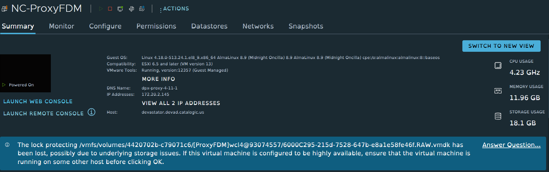 Click the virtual machine name to view the details. In this case, volumes have been manually removed while the VMs were running.\