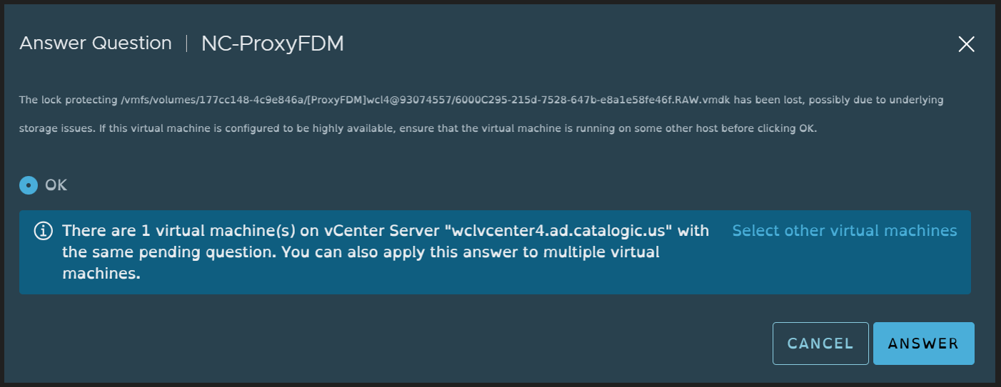 Click Answer to confirm the OK selection. Note that you can do it for all virtual machines facing the same issue at once, by clicking Select other virtual machines.