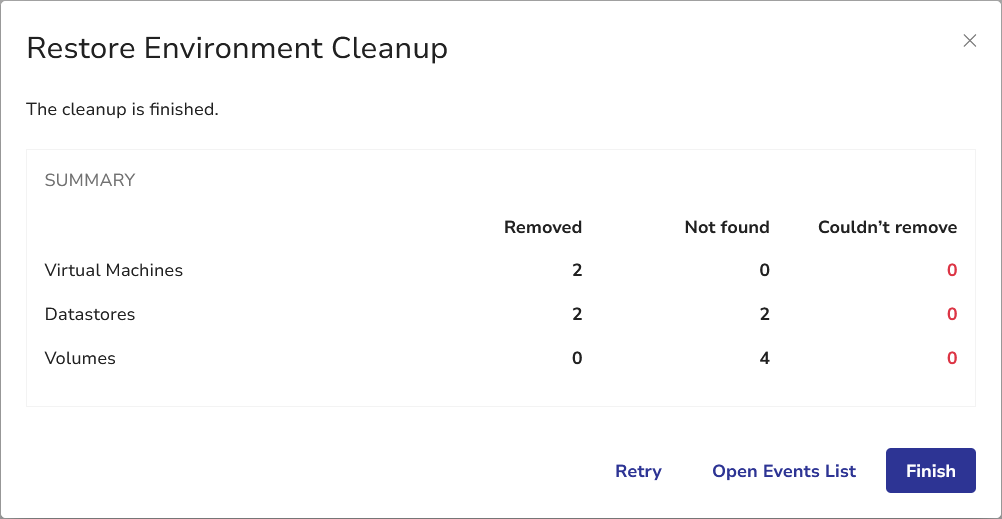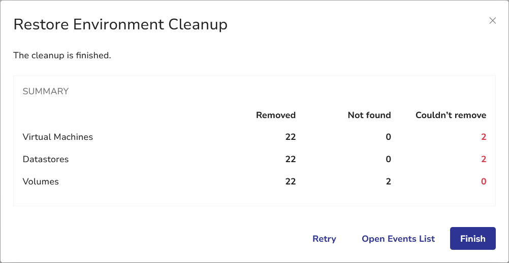 During cleanup, certain conditions may prevent normal VM power-off or removal. Such cases will be reported under the Couldn’t remove column in the Restore Environment Cleanup dialog.