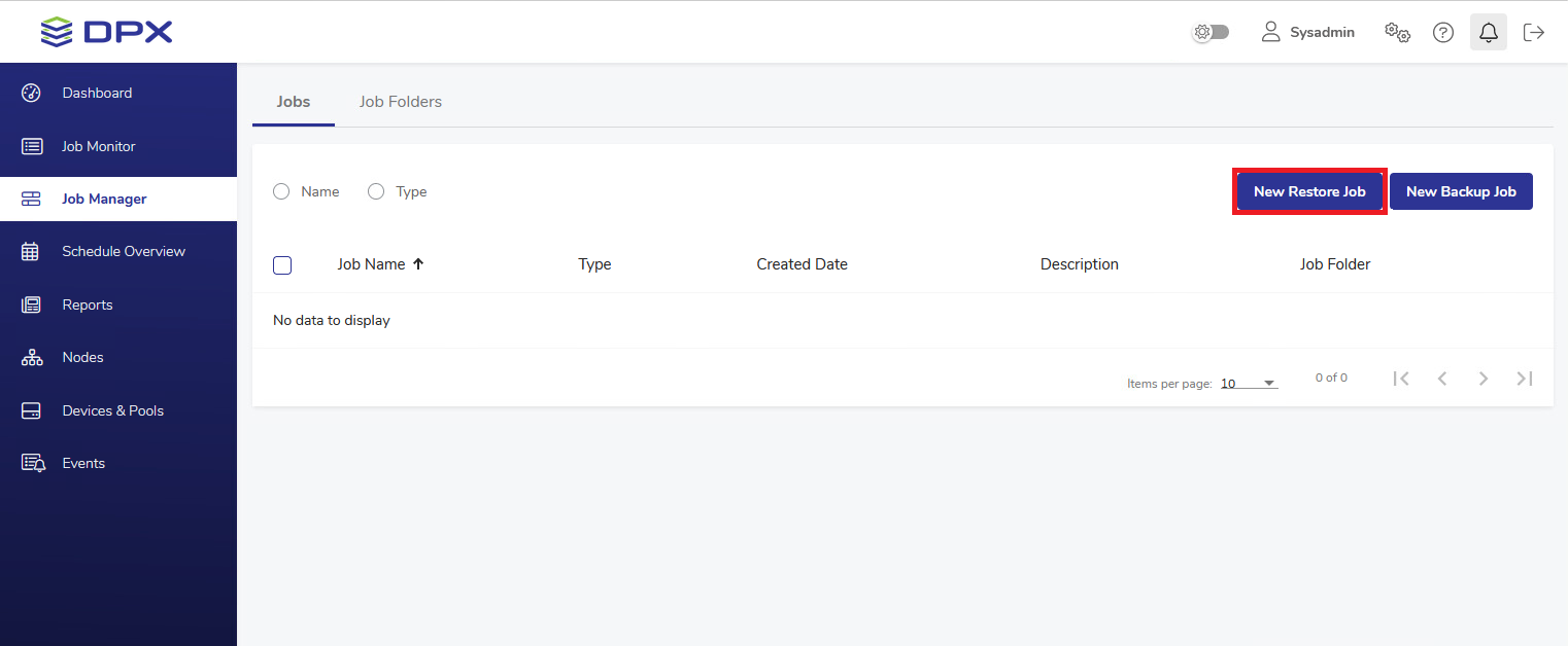 - In the main web interface view, go to Job Manager in the sidebar. Then select the New Restore Job button.