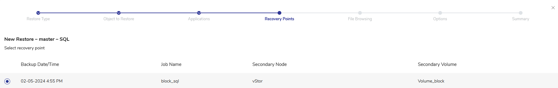 - Choose the appropriate recovery point from the available backups of the selected node.