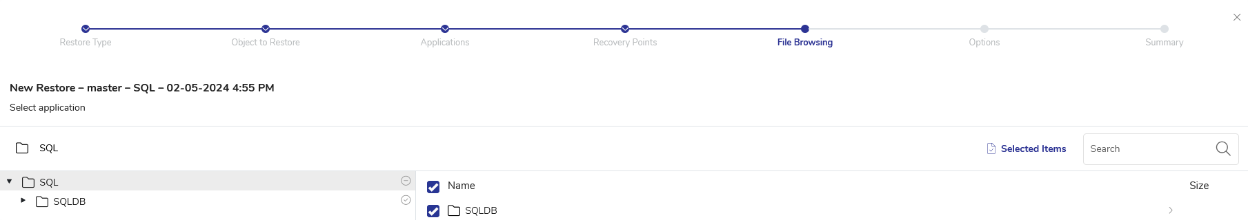 - In the File Browsing step, choose the specific databases you wish to restore. DPX allows for granular selection, enabling you to restore individual databases. Select all databases you want to restore and click Next.