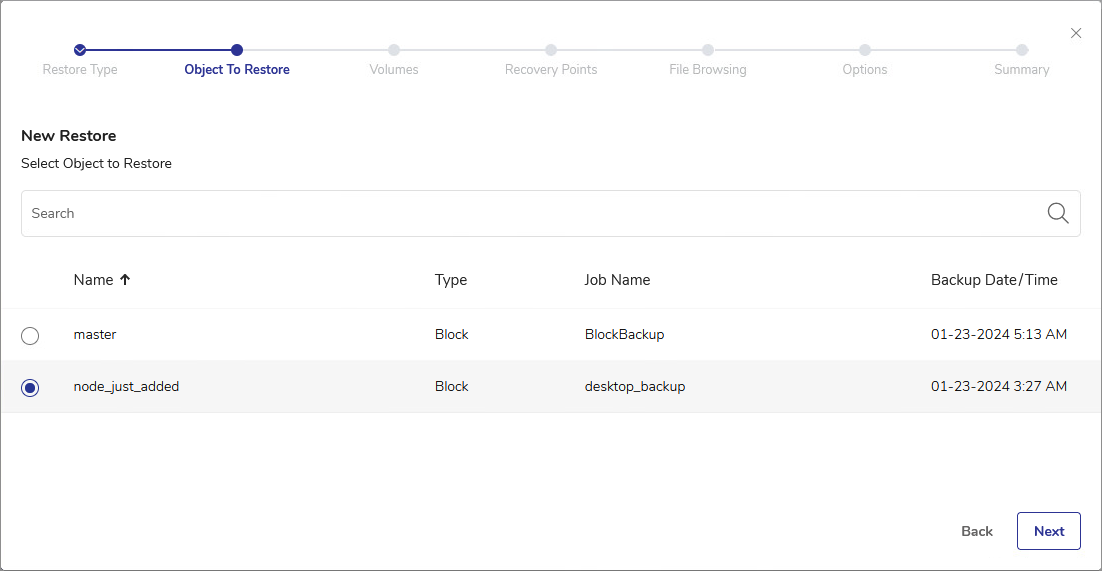 - The Object to Restore view shows all nodes that you backed up using DPX Block Backup. The available objects to restore can be sorted by Name, Type, associated Job Name, or the backup Date/Time.