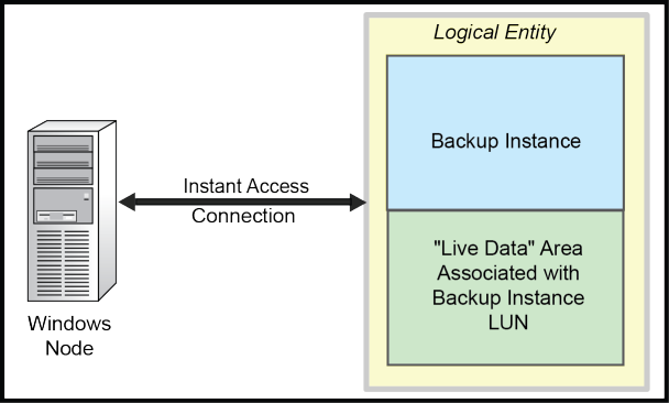The backup instance accessed through Instant Access appears to be a normal drive as if the backup instance had been copied to a new disk volume. The diagram following this section is a logical representation of a backup instance mapped to a drive letter. The Block backup instance on the secondary remains unchanged because the data is protected (read-only). Any modifications made are stored only in the “live data” area on the secondary. This “live data” area is created when the Instant Access iSCSI connection is made and is associated with the LUN. From that point, the “live data” area is continuously updated independently of the backup instance, but an integrated view is shown instead, that combines the backup instance and the “live data” area.