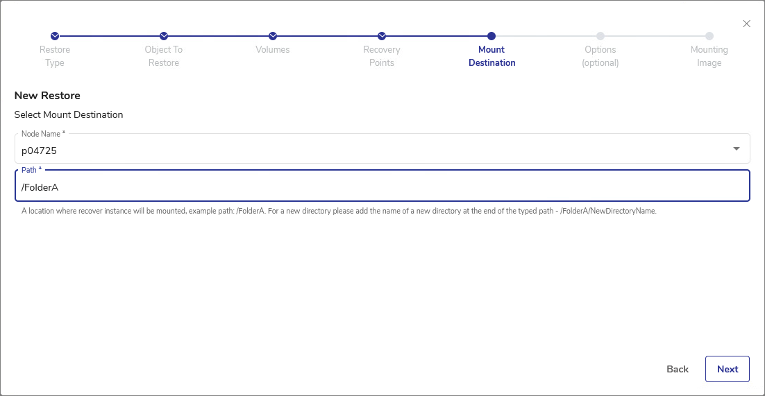 - In the Mount Destination step, select the destination Node Name from the drop-down list. Only Linux nodes will be available for selection.