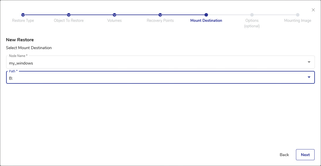 - In the Mount Destination step, select the destination Node Name from the drop-down list. Only Windows nodes will be available for selection.