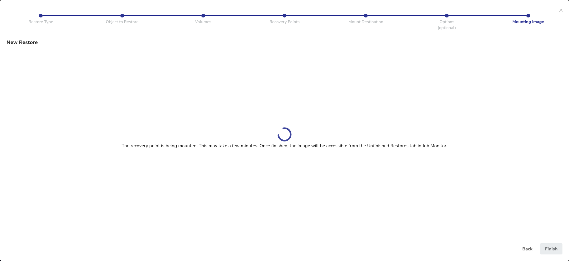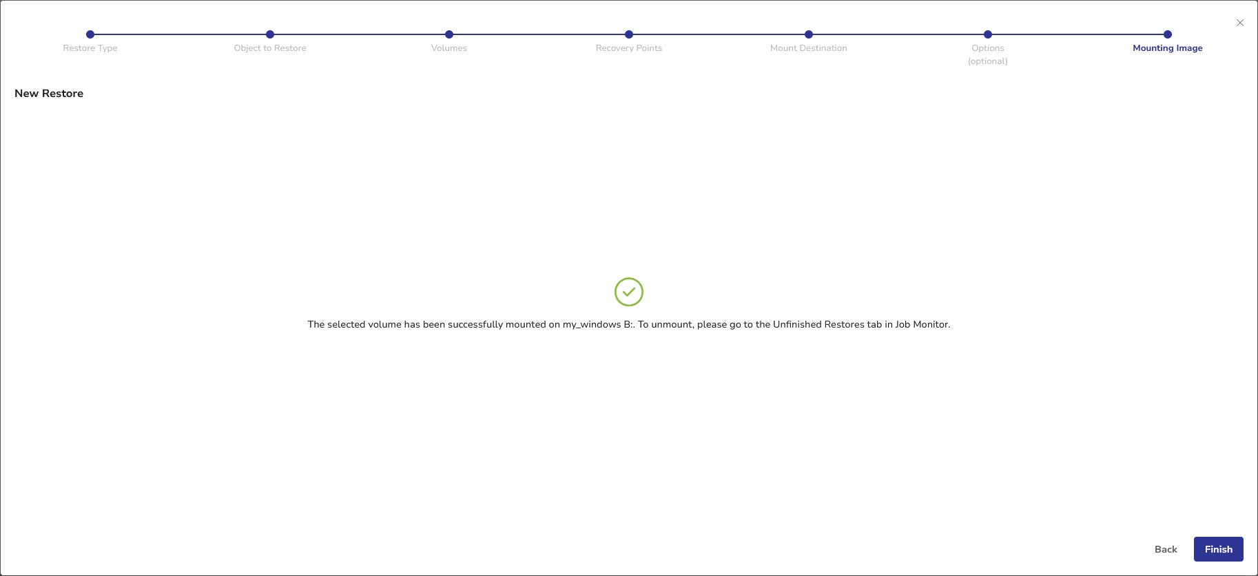 The volume will be unmounted from the machine and will disappear from the Unfinished Restores view.