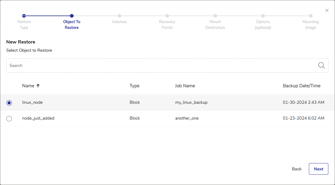 - The Object to Restore view shows all nodes that you backed up using DPX Block Backup. The available objects to restore can be sorted by Name, Type, associated Job Name, or the backup Date/Time.