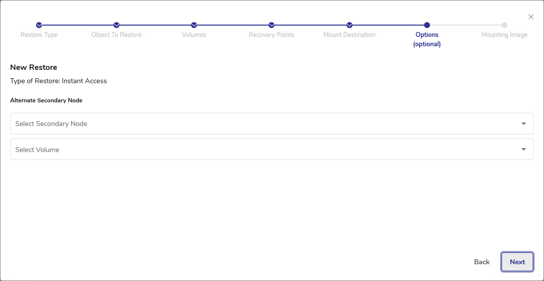 In all previous steps of creating a restore job, the available selections were based on the backup metadata stored on DPX. This means that DPX is aware of all backups made by the user and where they are stored. If, during backup or at a later stage, the backup data have been replicated to a secondary location and the primary location becomes corrupt or inaccessible, you can choose to restore your data from such secondary location using this option.- Select the Secondary Node from the drop-down list.