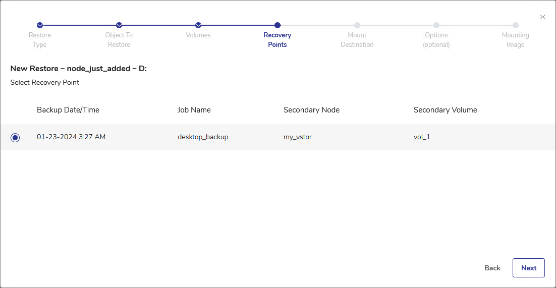 The available recovery points can be sorted by Backup Date/Time, Job Name, Secondary Node or Secondary Volume.