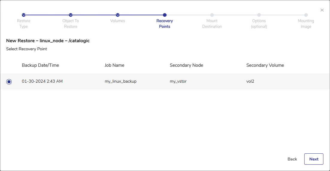 - In the Recovery Points step, select the recovery point to restore.