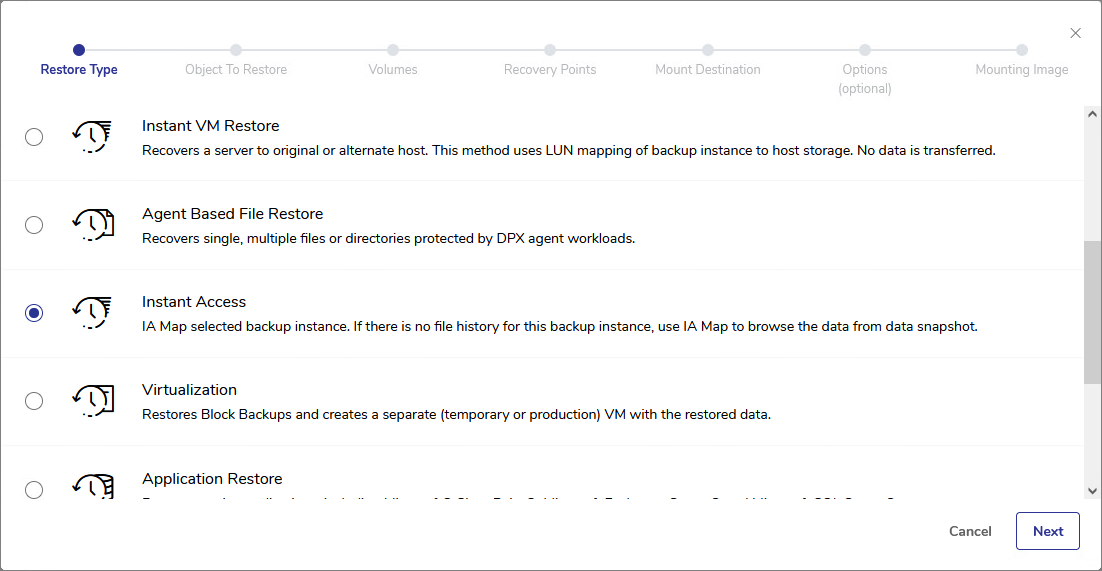 The Instant Access feature enables rapid, writable access to data and application recovery points without transferring data. A DPX Block Data Protection snapshot is mapped as a network disk to a target client node, where it can be accessed, copied, or put into production use as needed. This method restores data and applications in minutes, ensuring continuity in the event of data corruption or hardware failure. Using iSCSI target-attach technology, Instant Access maintains near-continuous availability.