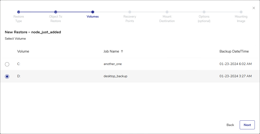 - Select the volume where the alternate backup is stored.