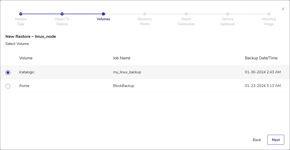 - From the list of volumes within the object, select the volume you want to mount as an Instant Access disk. Click Next.