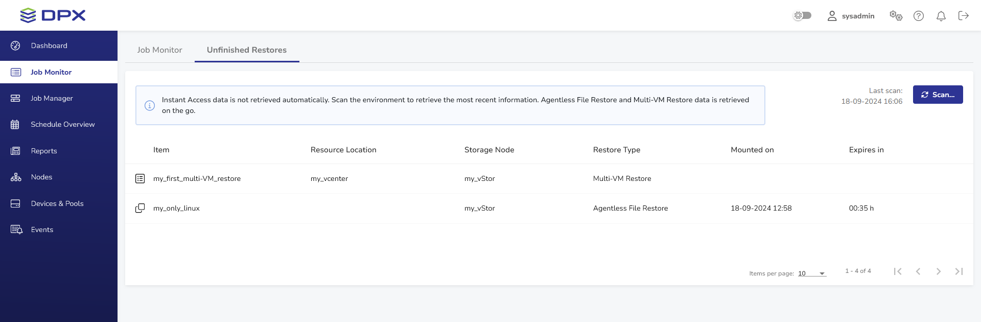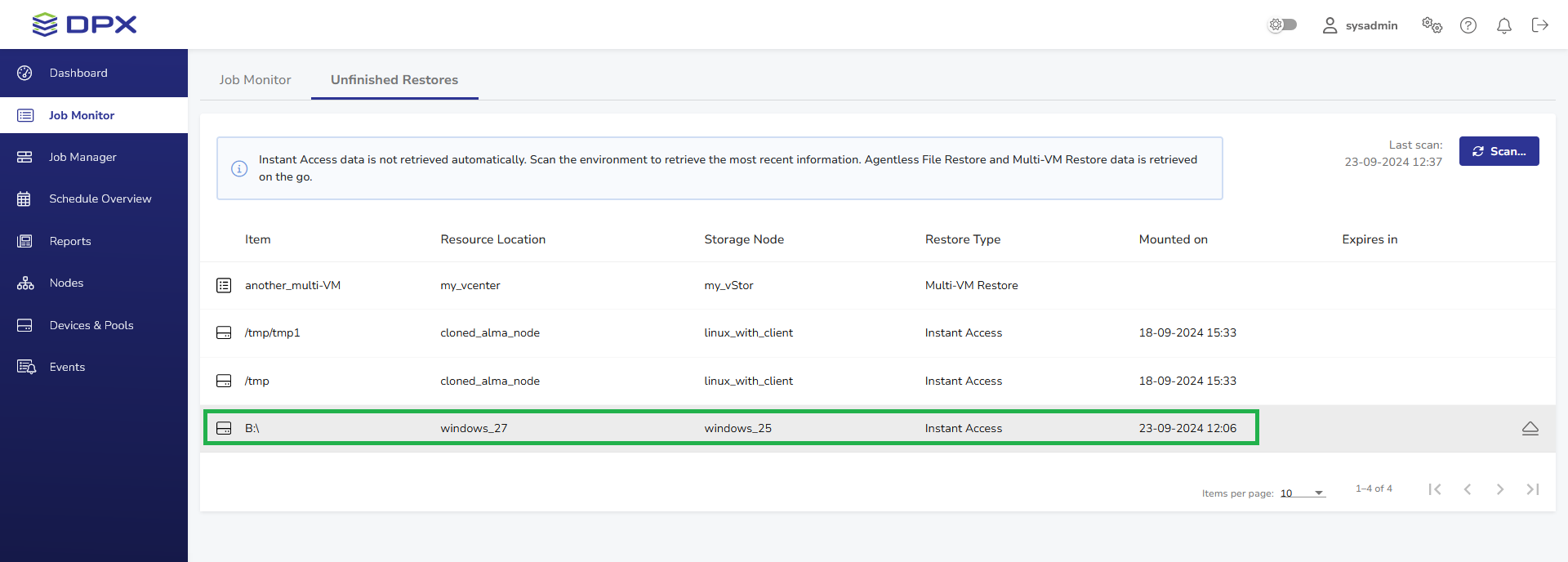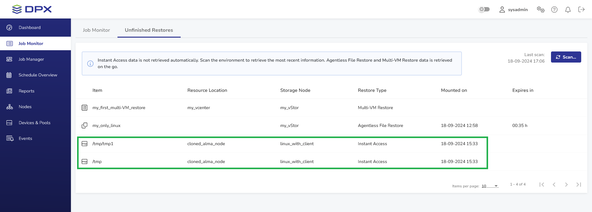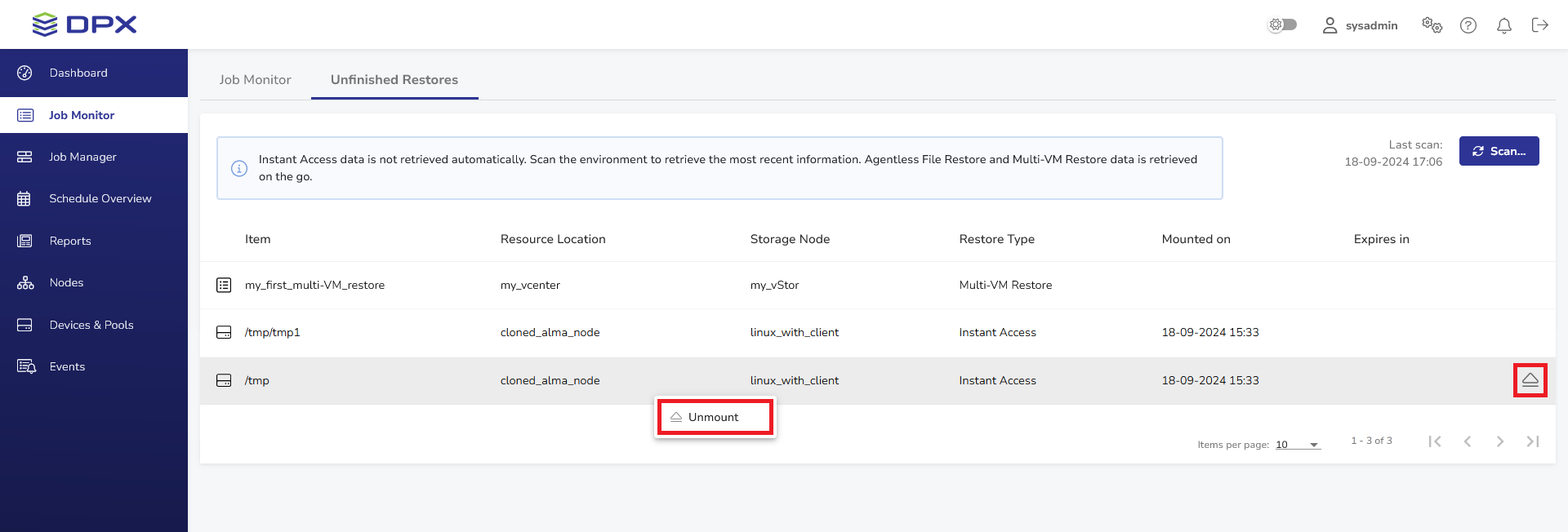 To manage the items mounted by DPX, go to the Unfinished Restores tab in Job Monitor.