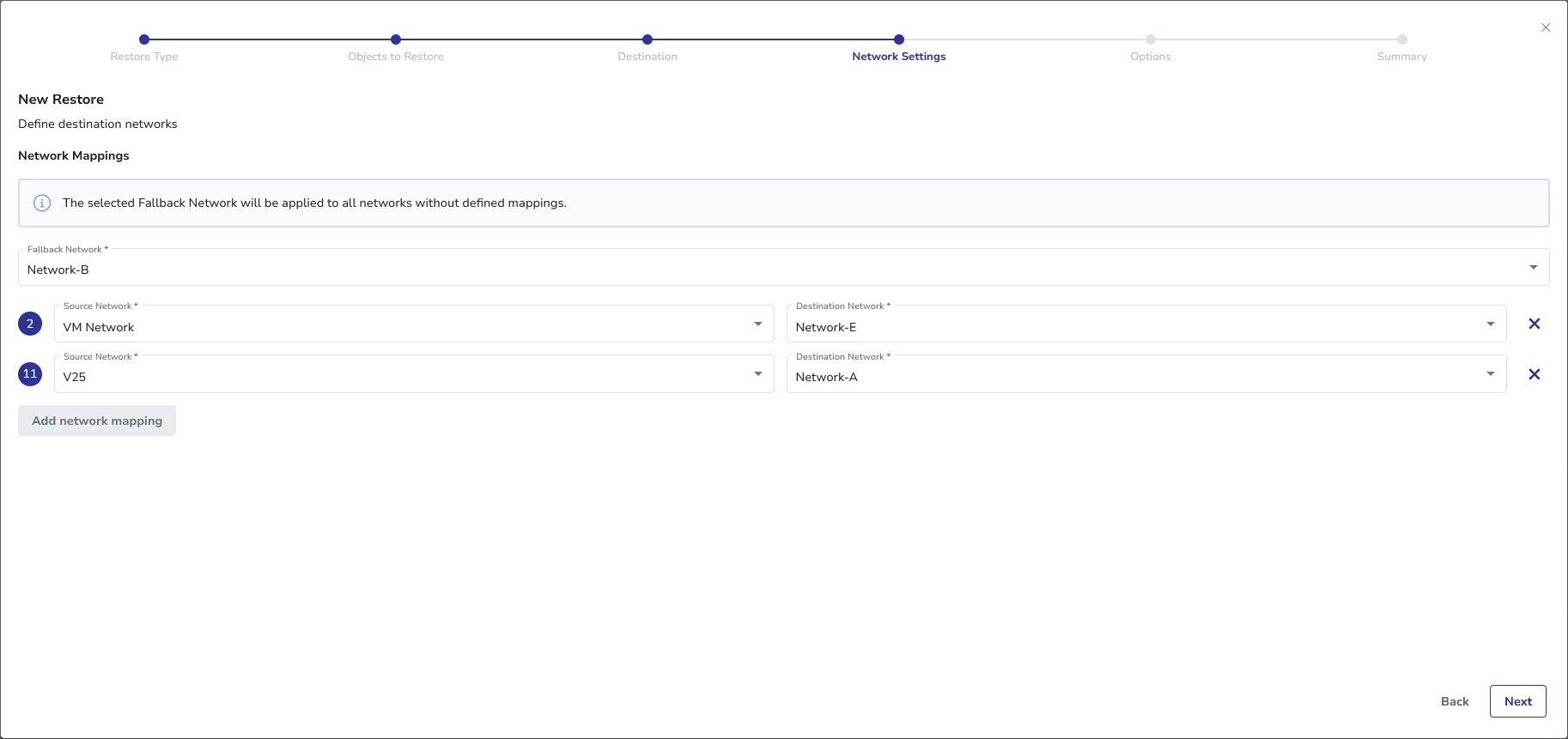 One of the networks available in the target vCenter is selected as the Fallback Network, i.e. all virtual machines without network mapping defined will be restored to this network. You can change this setting, by choosing another available network from the Fallback Network dropdown.