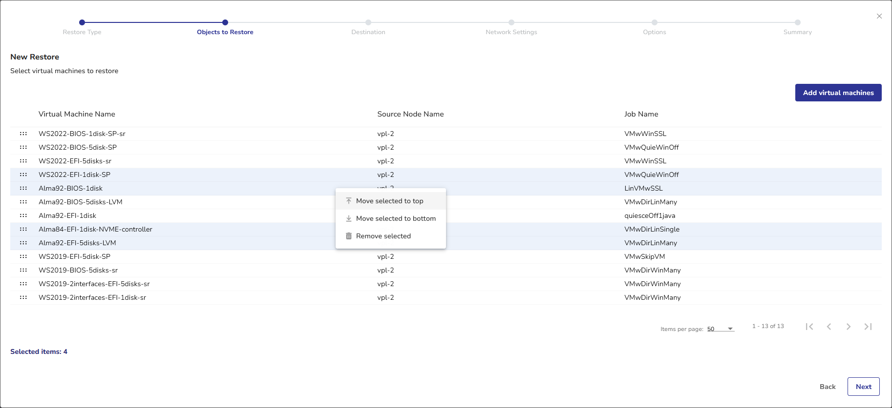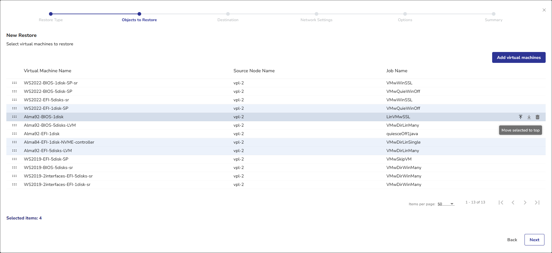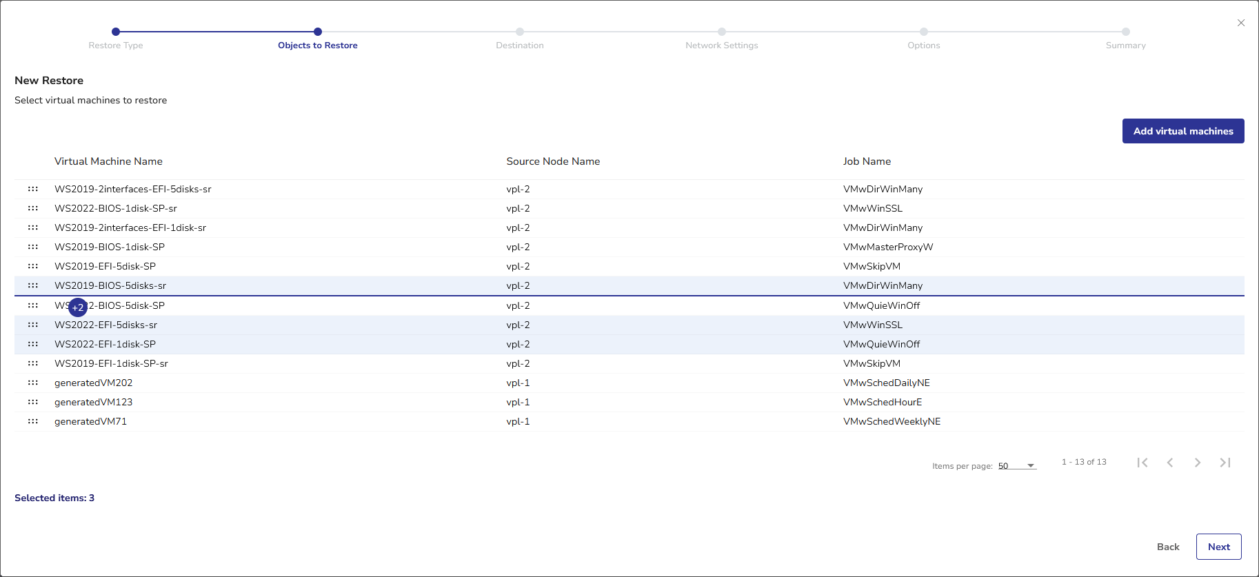 - The Selected items value at the bottom of the list indicates the total number of VMs selected within the current restore job definition. If you want to add more VMs to the Objects to Restore view, click the Add virtual machines button in the upper right corner.
