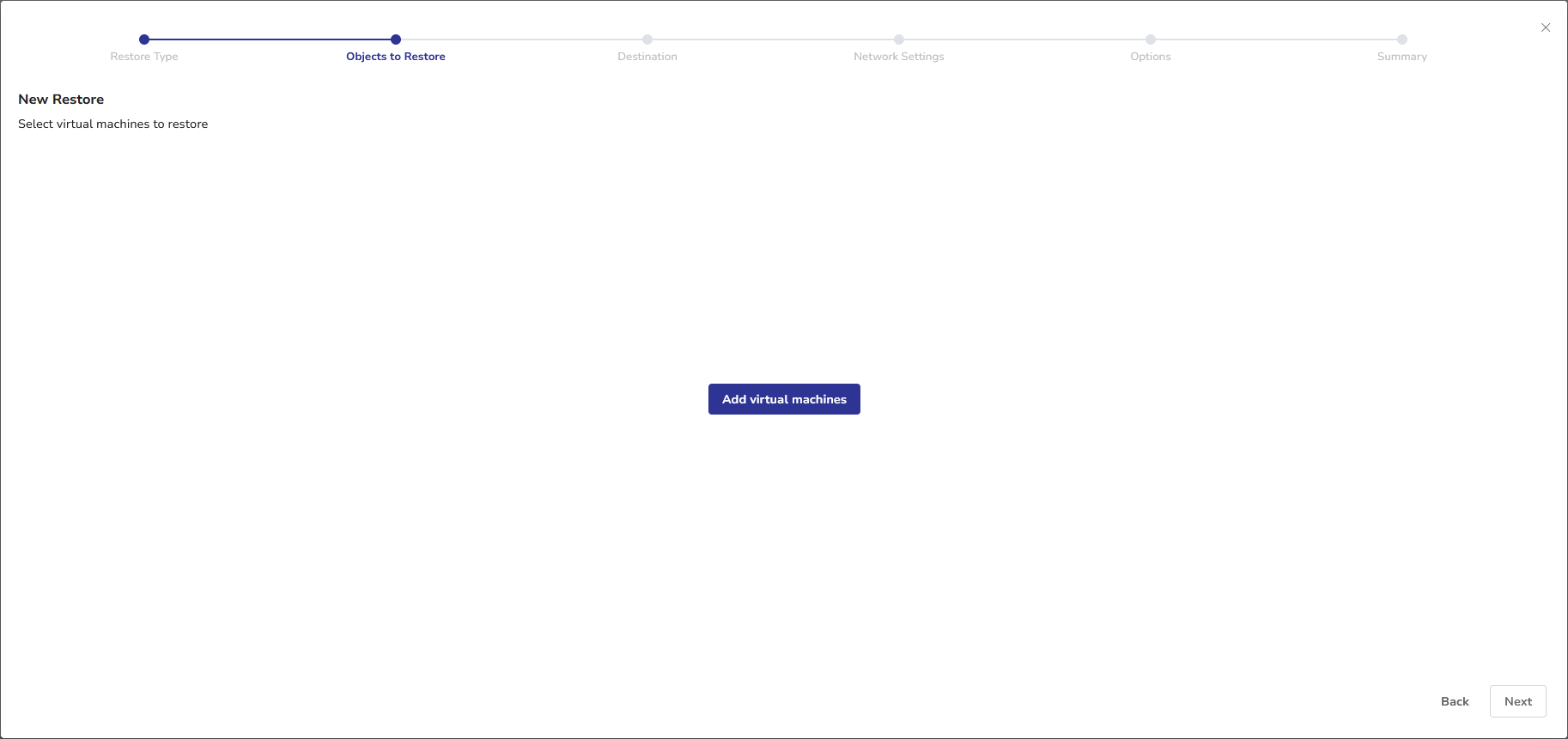 - The initial Objects to Restore view is empty. Click the Add virtual machines button to open the virtual machine selection dialog.