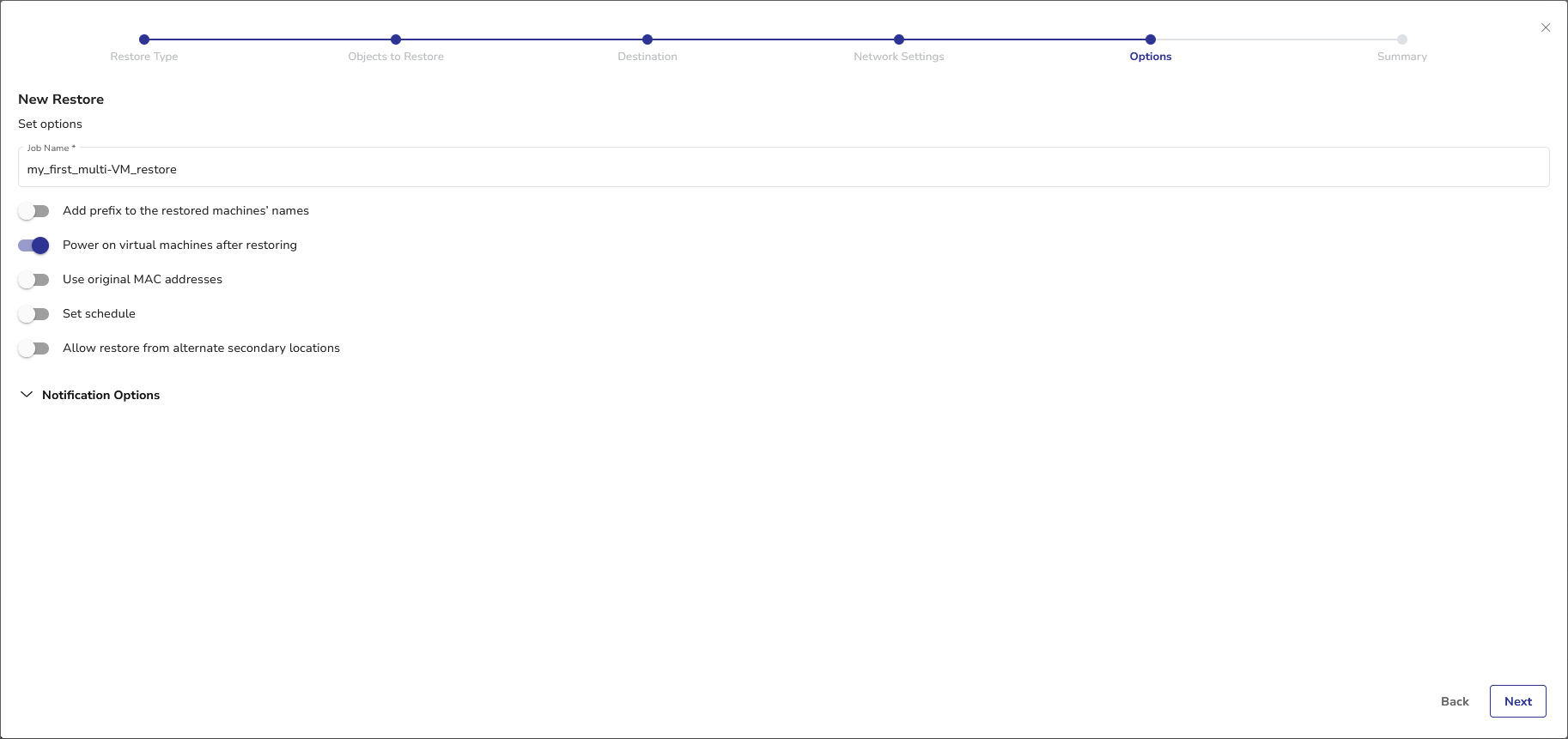 At this stage, the definition of the job is complete. Click Next and proceed to the Summary step or set Job Options for Multi-VM Restore.