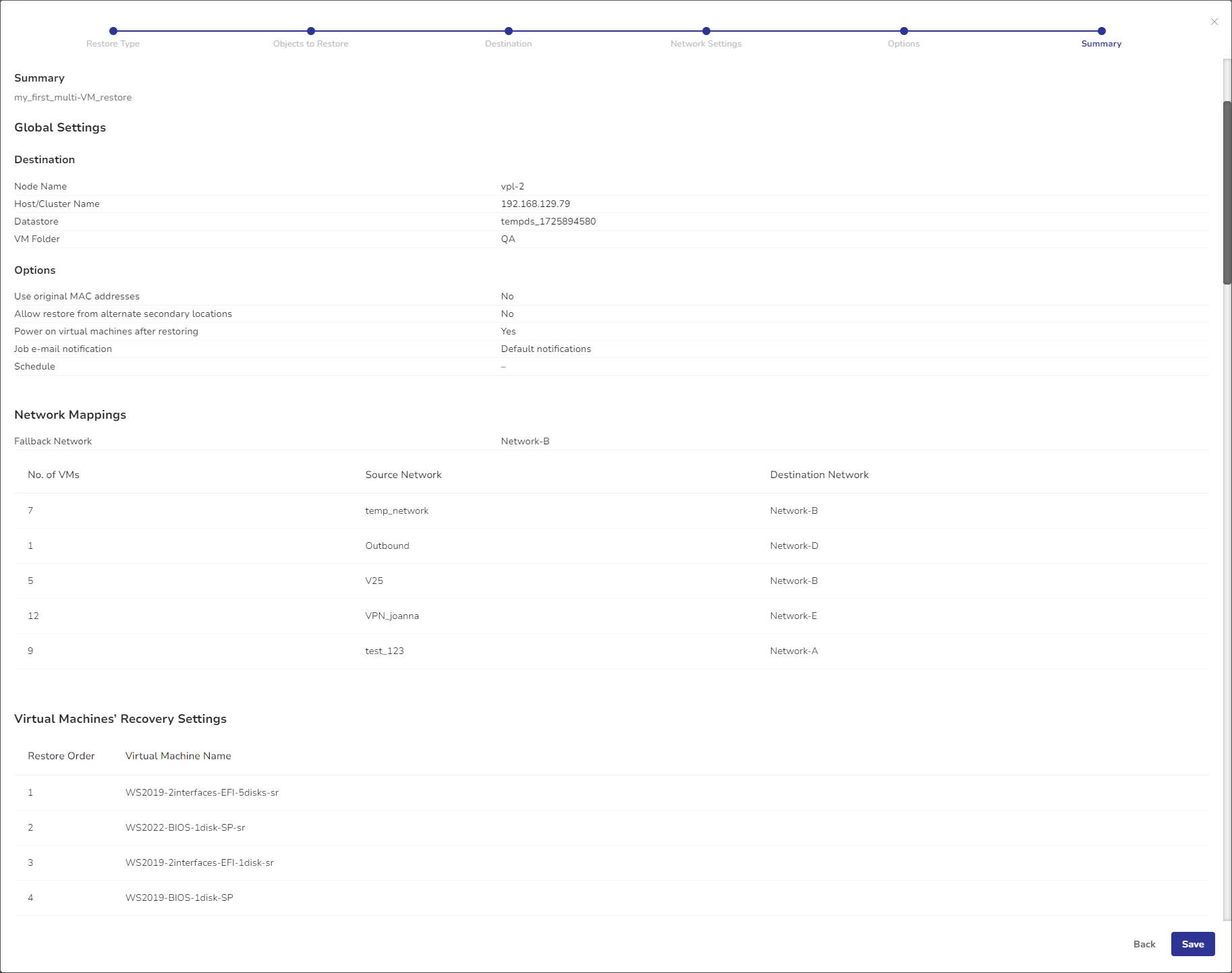 The Summary step displays the results of all previous steps and choices made while creating a Multi-VM Restore job definition.